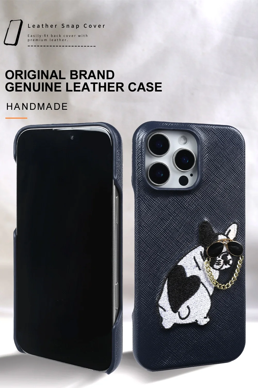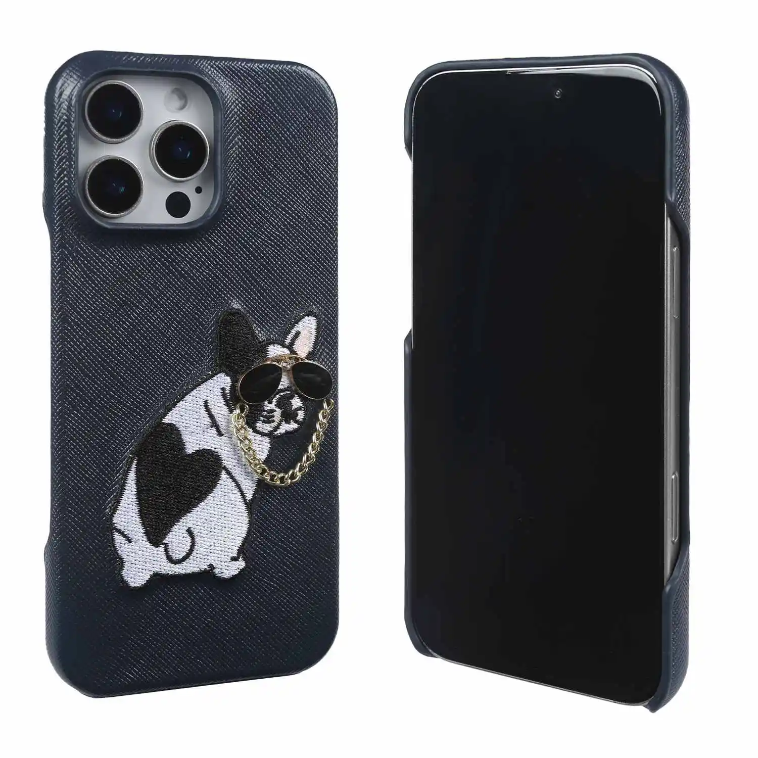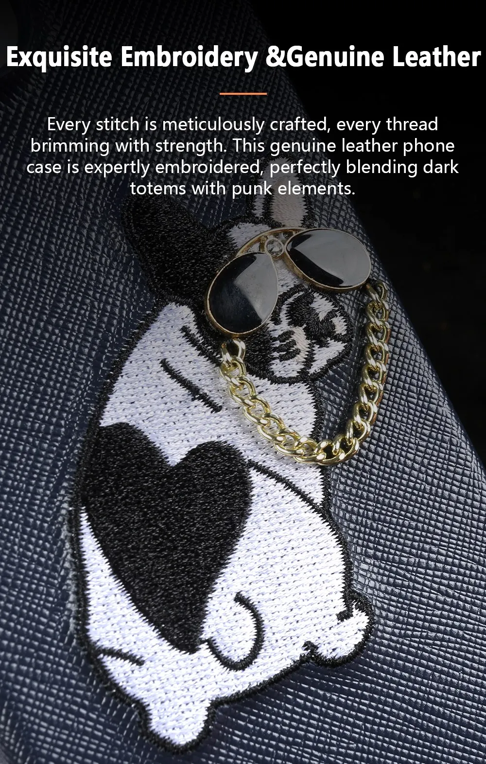 3D French Bulldog Embroidered Genuine Leather Phone Case