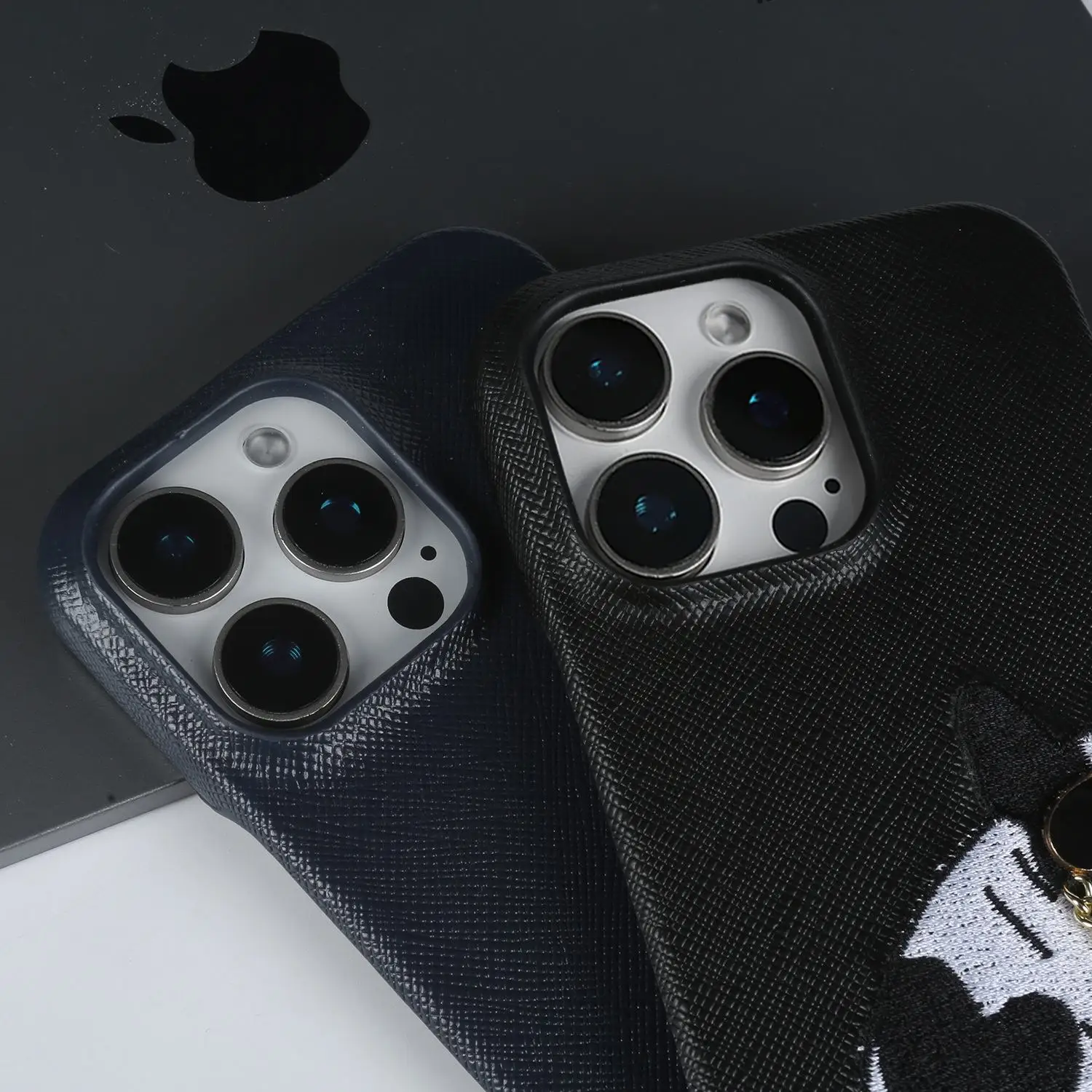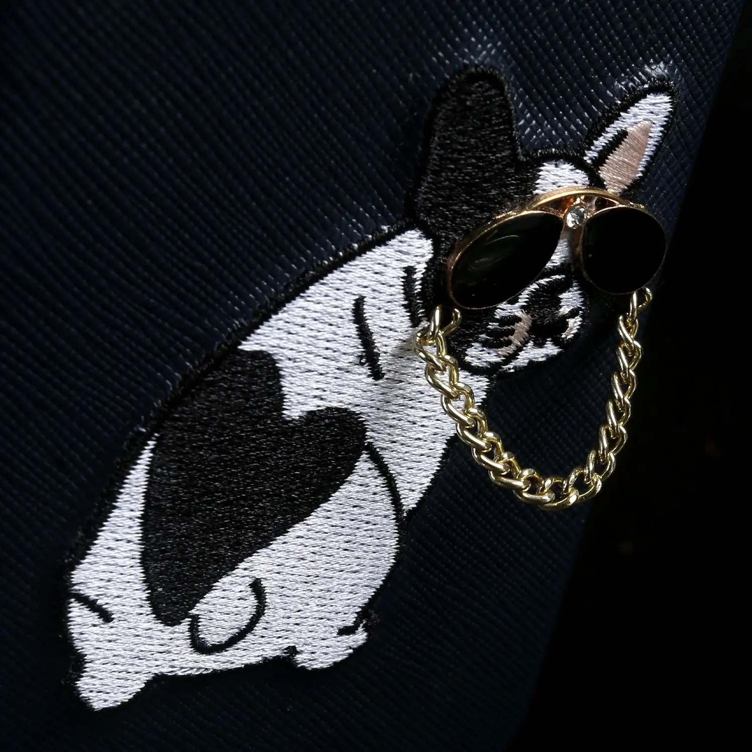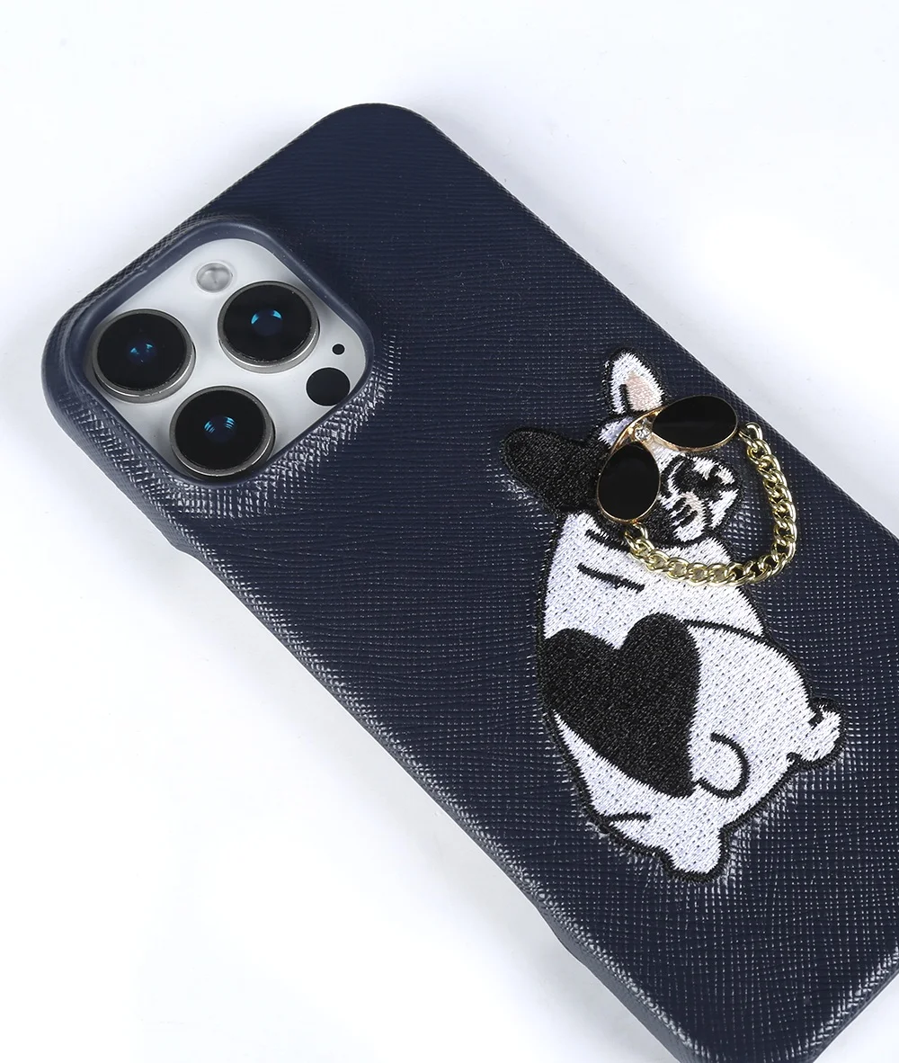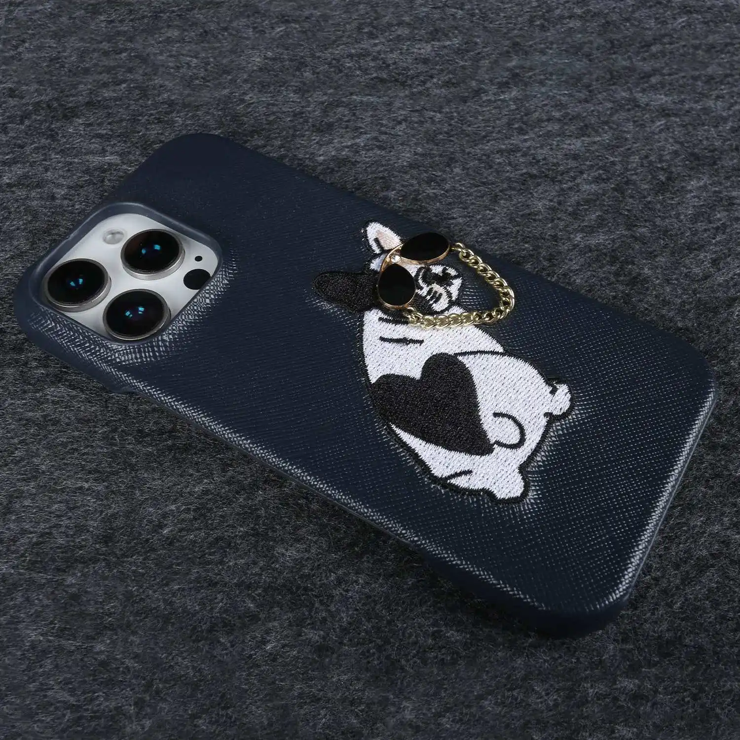 3D French Bulldog Embroidered Genuine Leather Phone Case